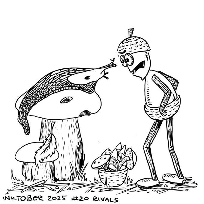 Druhou desítku kreseb uzavírá téma RIVALS - rivalové. Docela by mě zajímalo, kdo ty houby nakonec získal.