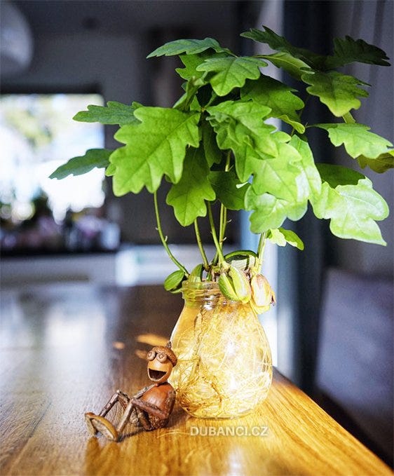 Předloni jsme zkoušeli mít dub v květináči, dokonce jsem to i zdokumentoval v článku Zasaďte si doma vlastní dub, ale nějaká plíseň nám ho sežrala, tak třeba letos to dopadne lépe.