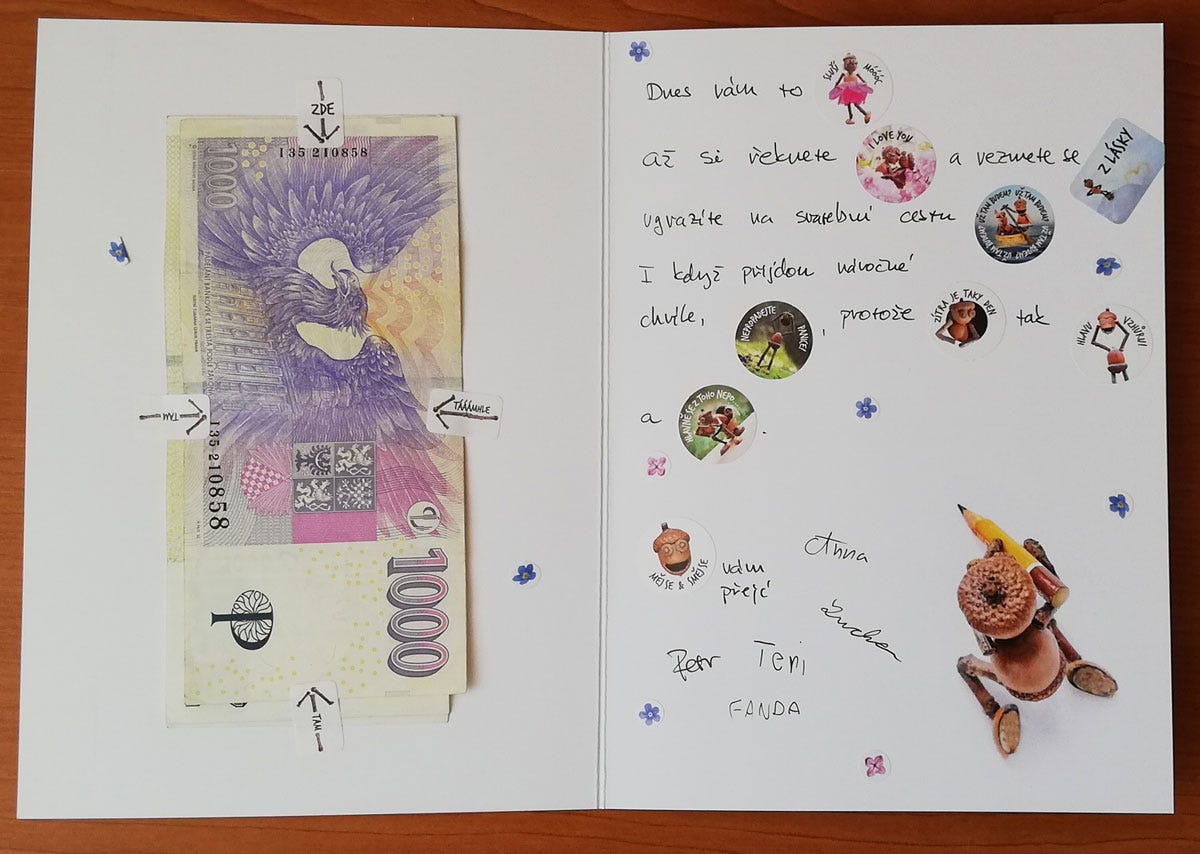 O víkendu jsme byli na svatbě a protože svatebčané už všechno měli, věnovali jsme jim nějaké peníze. Pro jejich předání jsme kreativně využili dubánčí přání k sňatku a také malé dubánčí samolepky s texty. Třeba to někoho také inspiruje :))