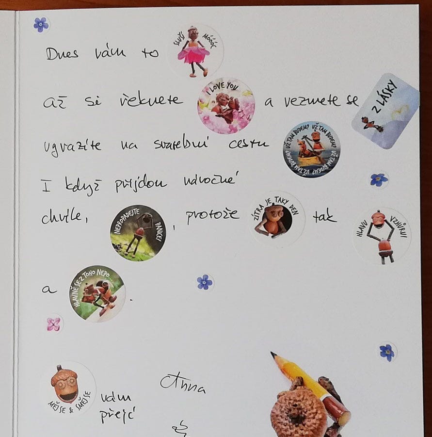 Přidávám ještě detail, aby šly přečíst texty na samolepkách, které doplňují vlastní text: