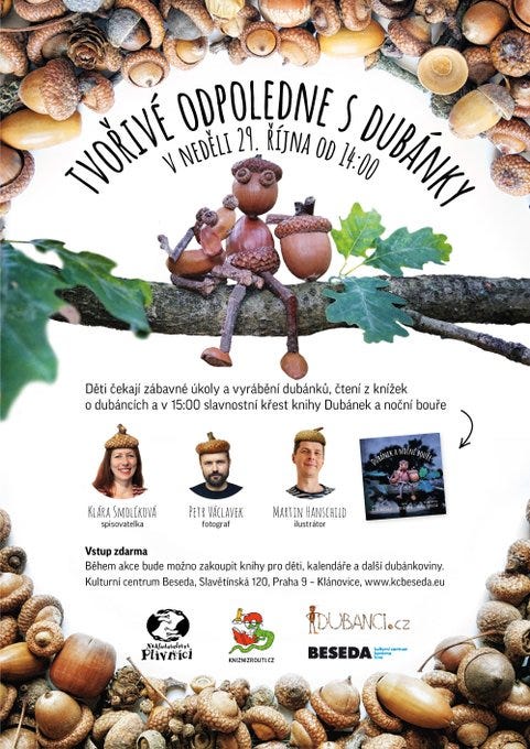 Pokud budete mít v neděli 29. října cestu kolem Prahy Klánovic, zastavte se ve zdejším kulturním centru Beseda, kde bude od 14 hodin probíhat Tvořivé odpoledne s dubánky a poté v 15:00 proběhne slavnostní křest naší nové knížky. Jste srdečně zváni, vstup zdarma.